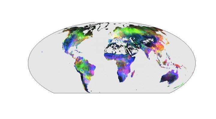 Climate-driven CO2 exchange: The spectral colors show the anomalies in the CO2 exchange on land during El Niño years. FLUXNET data have been upscaled by machine learning. Radiation anomalies are shown in red, temperature anomalies in green and water anomalies in blue. (Image credit: © Martin Jung)
