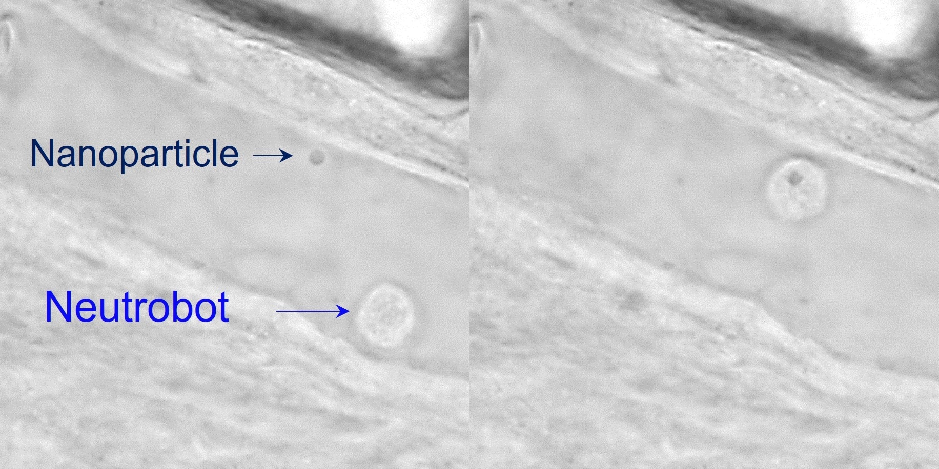 For example, a neutrobot was inserted into the surrounding tissue through the wall of a blood vessel. Another one demonstrated its ability for transporting drugs by picking up and moving a plastic nanoparticle. A neutrobot also absorbed the red blood cell fragments when it was pushed in their direction.