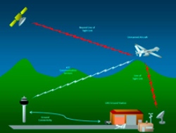 This illustration shows the communication links between ground stations, airports, satellites and unmanned aerial vehicles. (image credit: NASA)